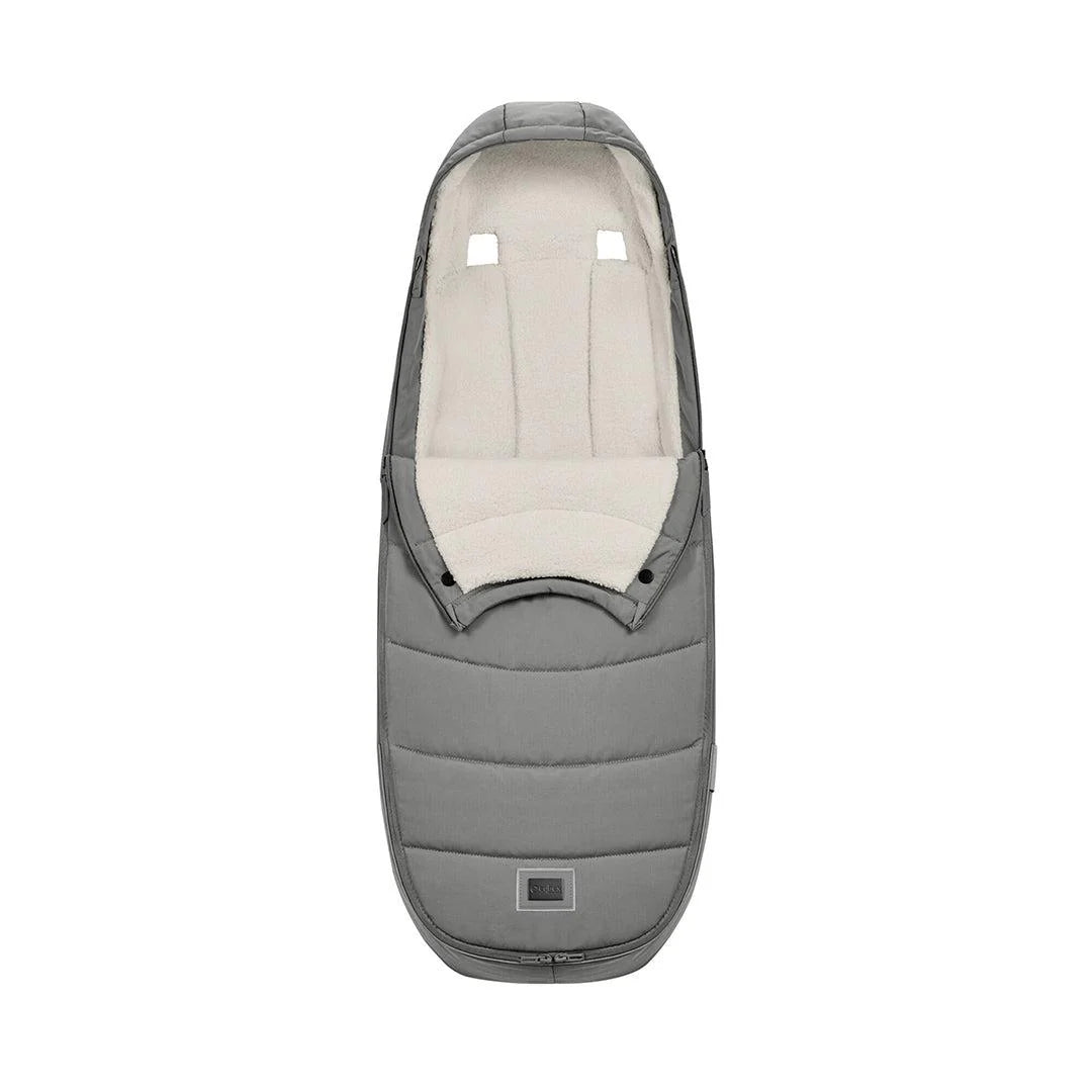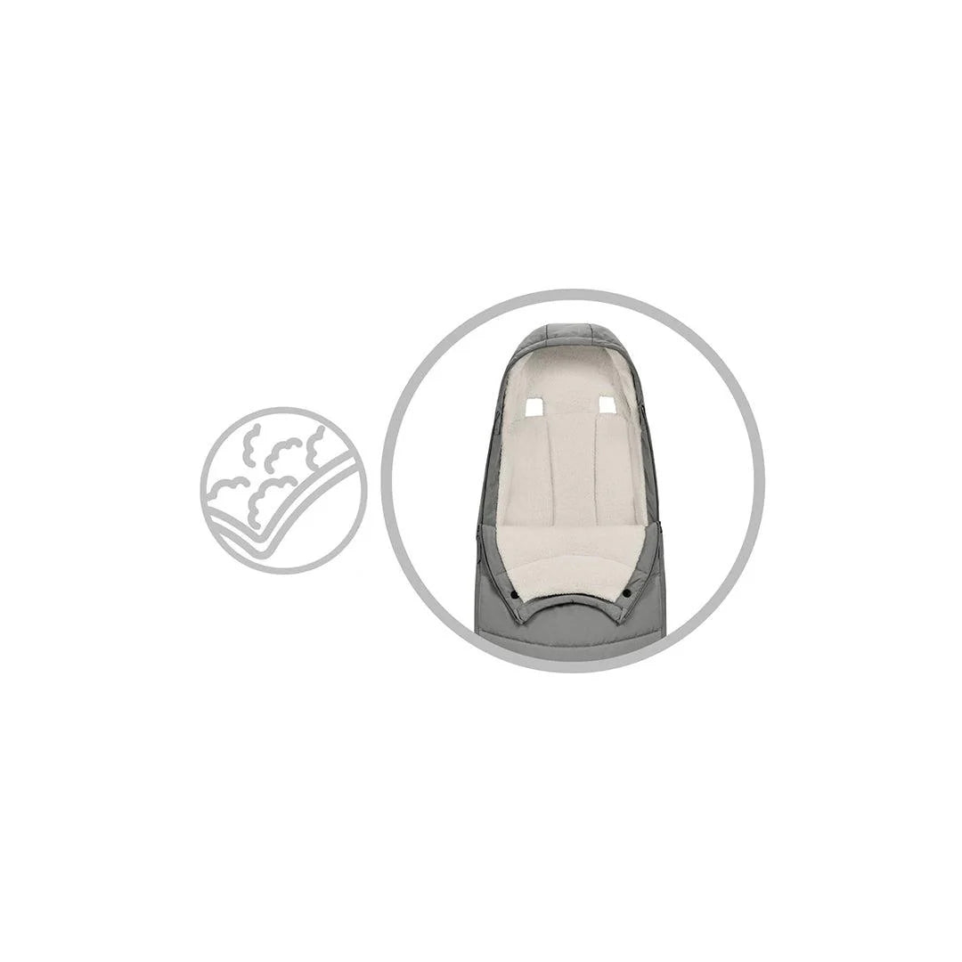 The CYBEX Platinum Footmuff in Mirage Grey offers a comfortable and cosy fleece lining to keep your little one warm and toasty when the temperature drops. Its water-repellent fabrics protect against cold weather, wind + light rain, and the upper materials feature leather-look applications to match new generation Priam, e-Priam and Mios strollers.