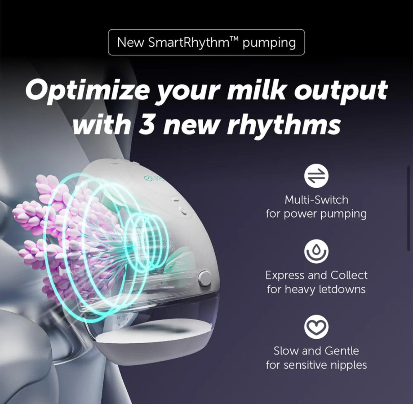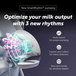 No feeding journey's the same. That's why our SmartRhythm™ pumping feature is customizable for your changing needs. Choose from: 1. Multi-Switch to optimise your milk output; 2. Express and Collect for heavier let-down; 3. Slow and Gentle for sensitive nipples; 4. Single-Switch for automatic let-down detect.