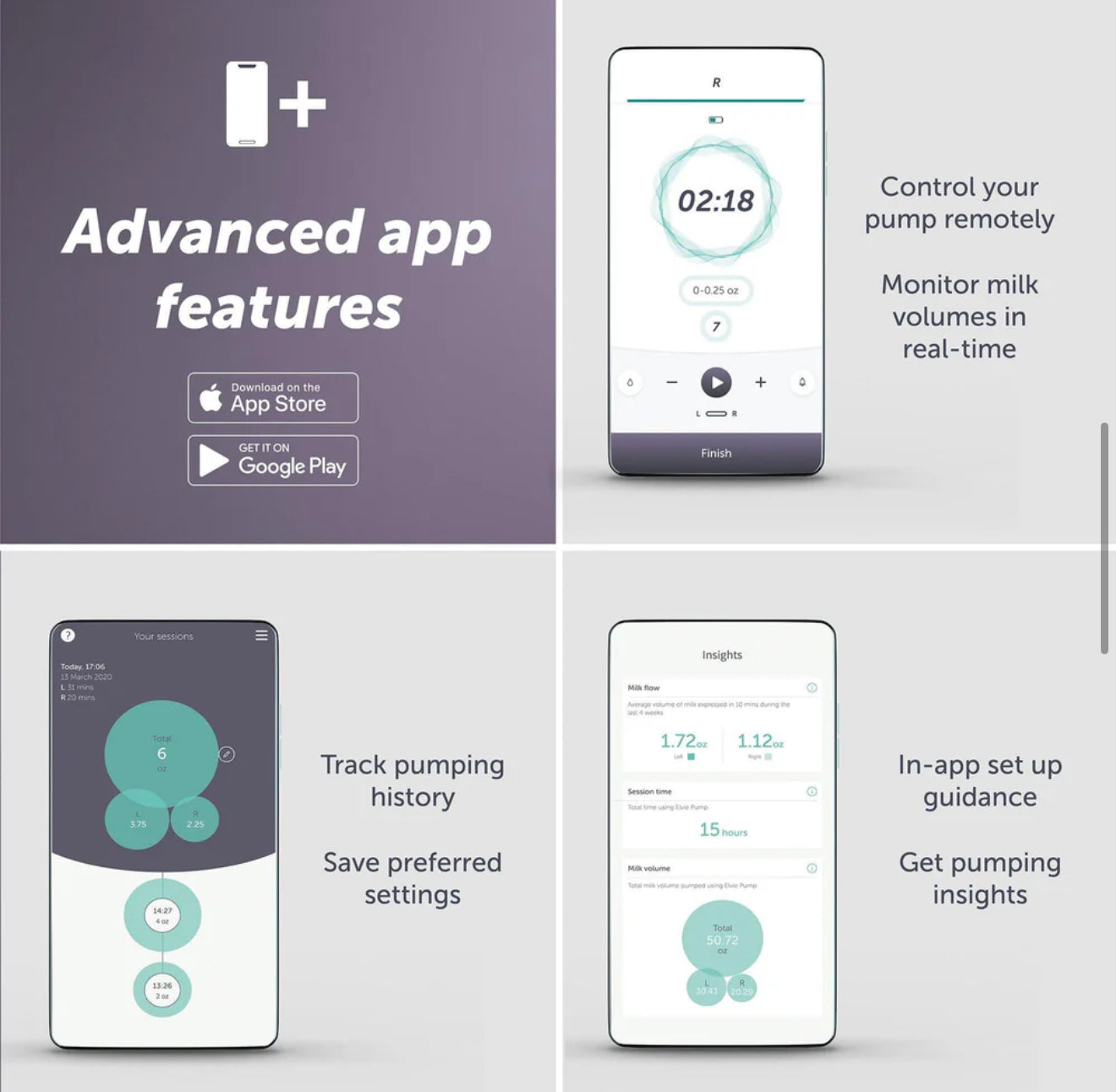 Control Elvie Pump from your phone, monitor milk volumes in real-time and track your pumping history - all without reaching into your bra. Getting started is easy with in-app guidance. Plus, save your preferred settings for a quick start every time.